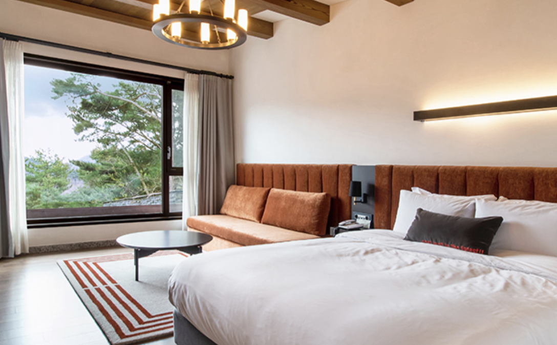 숙소의 객실은 넓고 탁 트인 공간으로, 산방산 뷰를 감상할 수 있는 창문이 매력적입니다. 또한, 리조트 내에는 28종의 조식 메뉴를 제공하는 담모라 키친과 야외 바베큐장, 편의점과 치킨집 등 다양한 편의 시설이 갖춰져 있어, 여행객들이 필요한 모든 것을 숙소 내에서 해결할 수 있습니다.