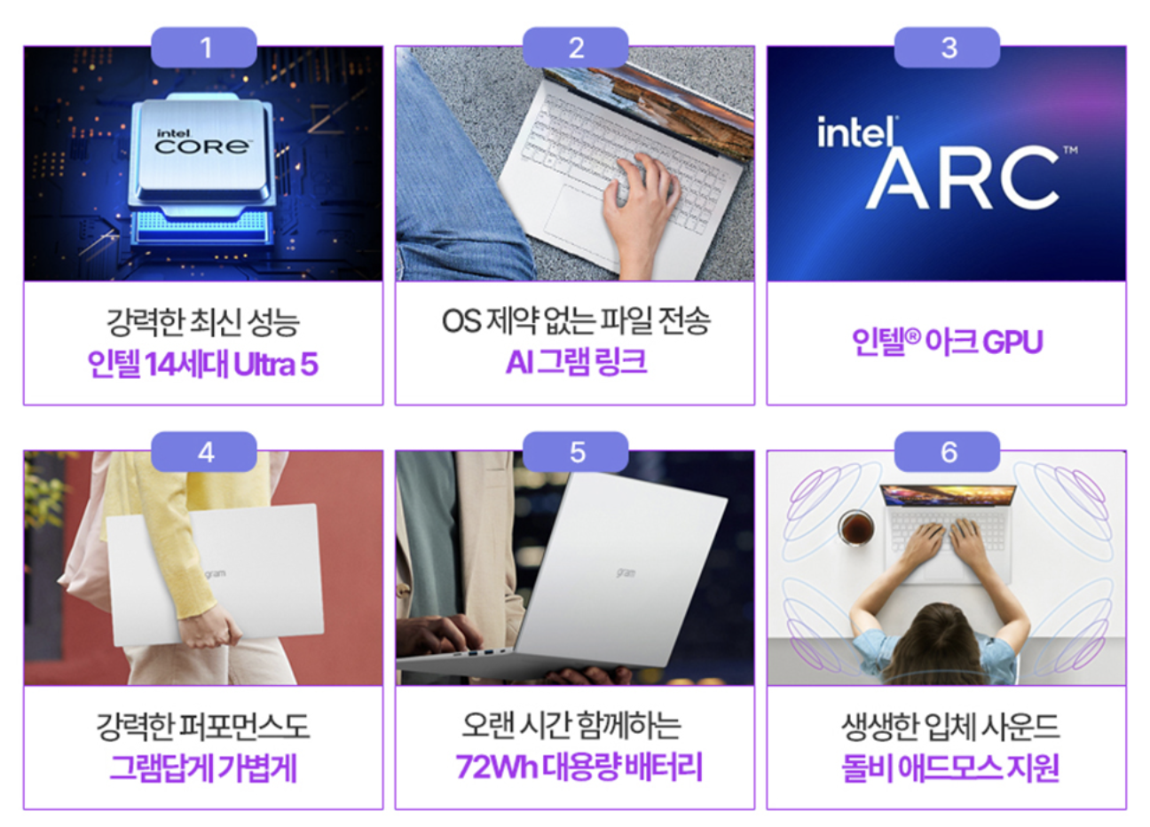 디스플레이 측면에서 LG그램 인텔 Ultra5는 16:9 비율의 FHD 해상도를 제공하며, sRGB 100% 색 영역을 지원하여 선명하고 생생한 화면을 보여줍니다. 키보드는 풀사이즈 텐키 배열을 포함하여 문서 작업에 적합하며, 키감도 우수합니다. 또한, 이 노트북은 내장 그래픽 성능도 향상되어, 인텔 아크 GPU를 내장하고 있어 그래픽 작업이나 게임에도 무리 없이 사용할 수 있습니다.