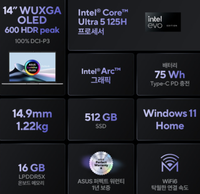 또한, 이 노트북은 1.2kg의 가벼운 무게와 14.4mm의 얇은 두께를 자랑합니다. USB-A 타입 C 포트 2개, HDMI 2.1 포트 1개, 이어폰 단자 등 다양한 연결 옵션을 제공하여 사용자의 편의성을 높였습니다. 14인치 OLED 디스플레이는 선명한 색상과 높은 대비를 제공하며, ASUS OLED Care 기능으로 화면 번인 걱정 없이 사용할 수 있습니다.