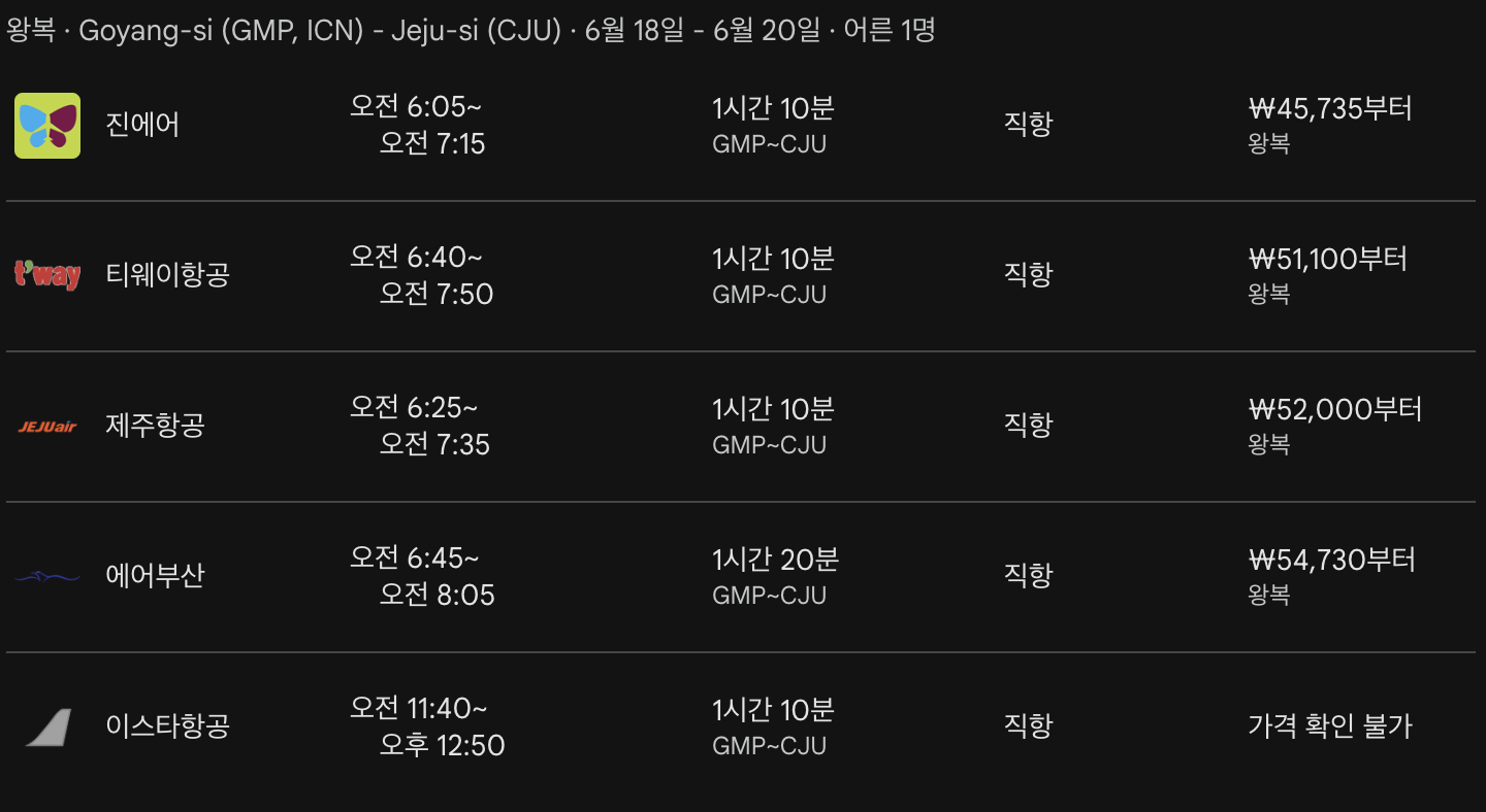 - 제주항공 7C103, 출발: 오전 6:25 도착: 오전 7:35, 1시간 10분, 가격: ₩52,000