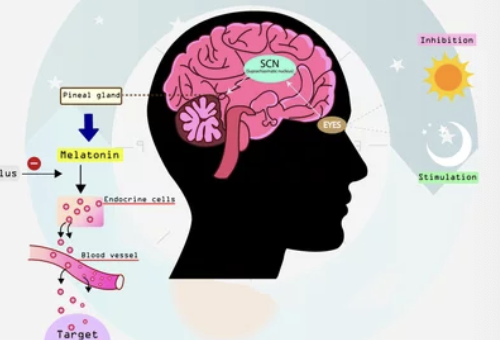 멜라토닌은 뇌의 송과선에서 분비되는 호르몬으로, 수면-각성 주기를 조절하는 역할을 합니다. 밤이 되면 멜라토닌 분비가 증가하여 졸음을 유발하고, 아침이 되면 분비가 감소하여 잠에서 깨도록 돕습니다.