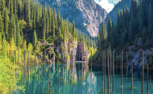 🔹 4. 카인디 호수(Kaindy Lake) – 신비로운 물속 숲 🌊
